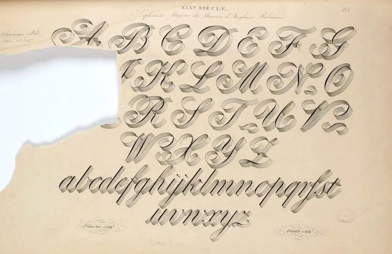 A page from Joseph-Balthazar Silvestre's “alphabet album” (1843), a beautiful book of calligraphy and typographic engraving. Read more about the book at Public Domain Review.